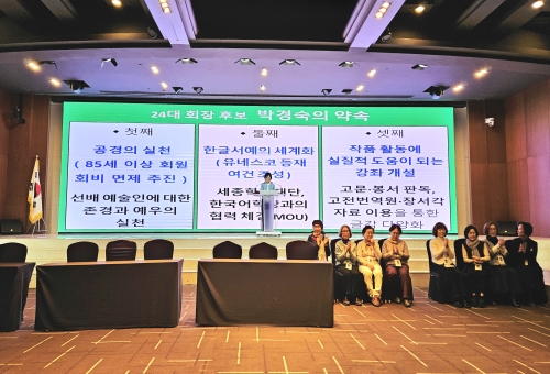 과천문화원 이사 ‘죽리(竹里) 박경숙’ 선생님께서 제24대 갈물회 회장으로 선출되셨습니다. 현재 과천서예가협회 부회장으로 한글 서예의 가치와 품격을 널리 알리며 활발한 활동을 하고 계시던 중 갈물회 회장으로 선출되어 더욱 서예 발전의 중심 역할에 앞장서 주시길 기대하며, 다시 한번 진심으로 축하드