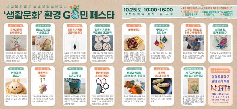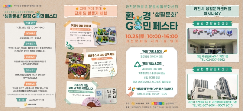 〔‘생활문화’ 환경 Go민 페스타〕 일시 : 10월 25일(토) 10:00~16:00 장소 : 과천문화원 지하1층 일대 |