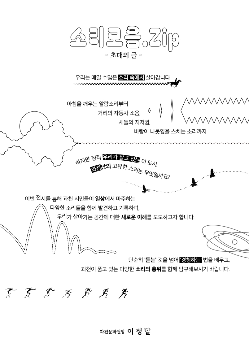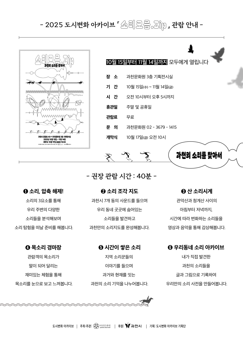 「과천문화원」 도시변화 아카이브 전시 《소리모음.Zip》초대합니다. ◇전시간 : 10월15일(수) ~ 11월14일(금) ◇개막식 : 10월17일(금) 10시 ◇전시 : 과천문화원 3층 기획전시실 ◇접수 및 문의 : 02-3679-1414