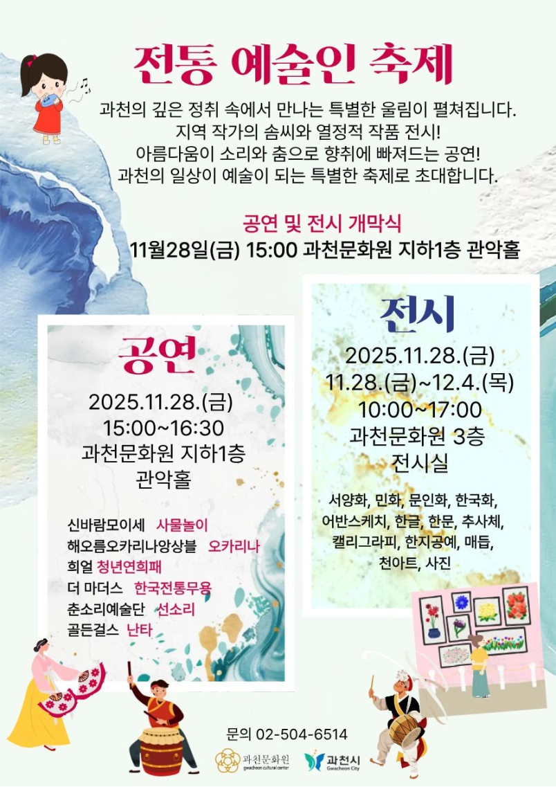 과천의 깊은 정취 속에서 만나는 특별한 울림이 펼쳐집니다. 과천의 일상이 예술이 되는 특별한 축제로 초대합니다. #전통예술인#공연#전시#회화#서예#공예#사물놀이#오카리나#연희#한국전통무용#선소리#난타 |