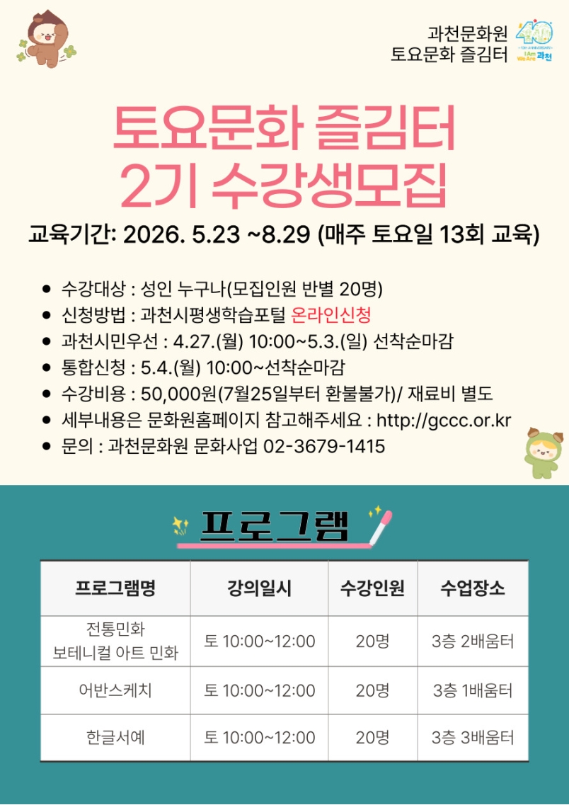 토요문화 즐김터 ’ 수강생 모집 안내 ◇ 교육기간 : 2026.5.23.~ 8.29 ( 매주 토요일 13 회 교육 ) ◇ 신청방법 : 과천시평생학습포털 온라인신청 ◇ 과천시민우선 : 4.27( 월 ) 10:00 ~5.3( 일 ) 선착순마감 ◇ 통합신청 : 5.4( 월 ) 10:00~ 선착순마감 ◇ 수강비용 : 50,000 원 (7 월 25 일부터 환불불가 )/ 재료비 별도 . ◇ 세부프로그램은 과천문화원 홈페이지 참고해주세요 . http://gccc.or.kr ◇ 문의 : 과천문화원 문화사업 02-3679-1415 |