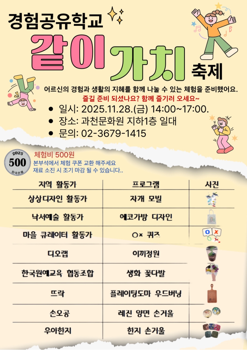 '경험공유학교 같이 가치 축제' 에 초대합니다. 2025.11.28.(금) 14:00~17:00 과천문화원 지하1층 일대 문의 02-3679-1415