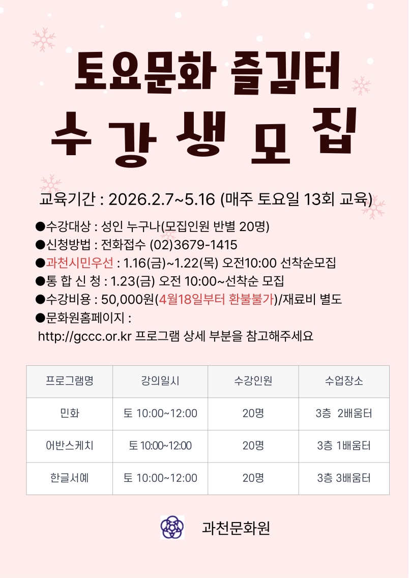 [ 과천문화원 ]‘ 토요문화 즐김터 ’ 수강생 모집 안내 ◇ 모집기간 : 과천시민 우선접수 - 1 월 16 일(금) 10:00 ~ 1 월 22일(목)17:00 까지 선착순 모집 통합신청 - 1월 23일(금) 10:00 ~ 선착순 모집 ◇ 수강료 : (13회 ) 50,000원 . ◇ 접수 : 선착순 전화접수 . ◇ 접수 및 문의 : 02-3679-1415 ◇ 세부프로그램은 과천문화원 홈페이지에서 확인 가능합니다 . |